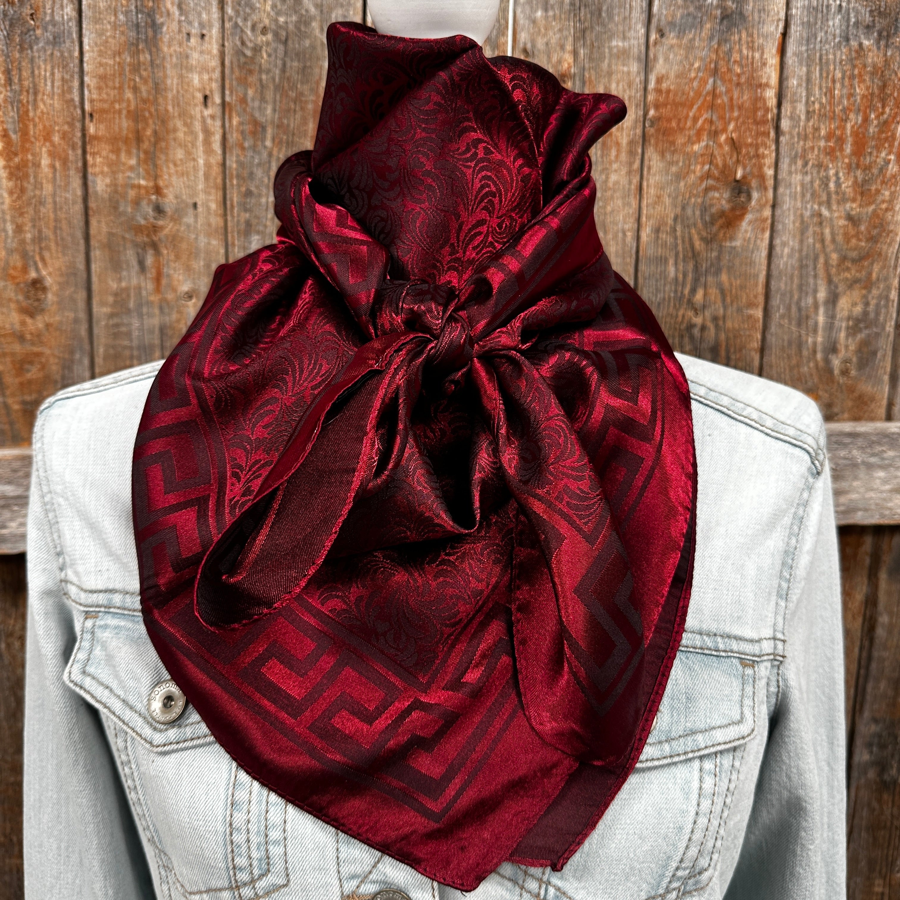 Our classic wild rag/scarf is burgundy with a floral jacquard pattern. A perfect square - measuring 35"x35". Adding that extra touch of a western style to your outfit.