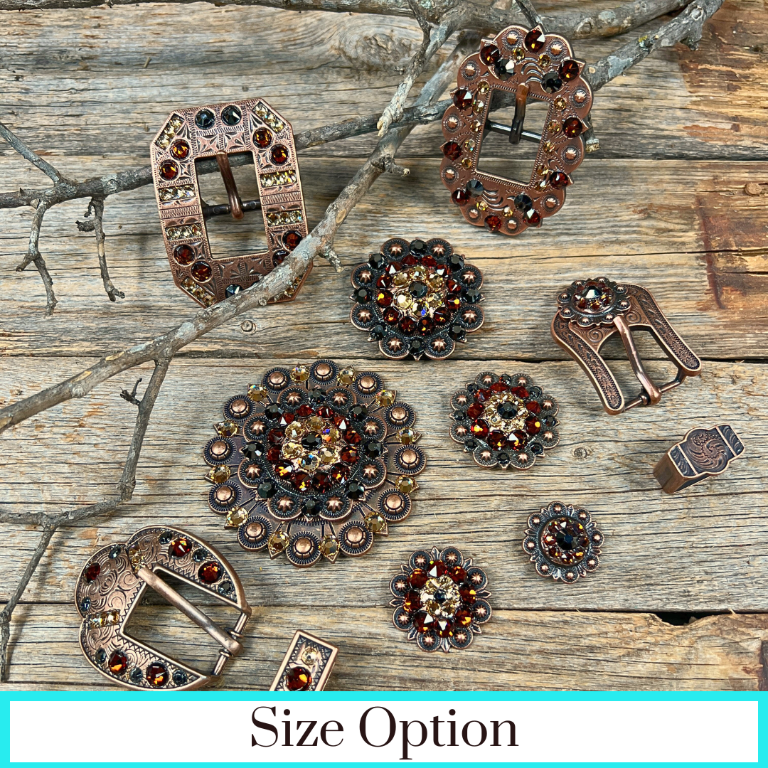 Copper Jet - Champagne - Topaz - Crystal Conchos Sizes from 1"-3" and Buckles