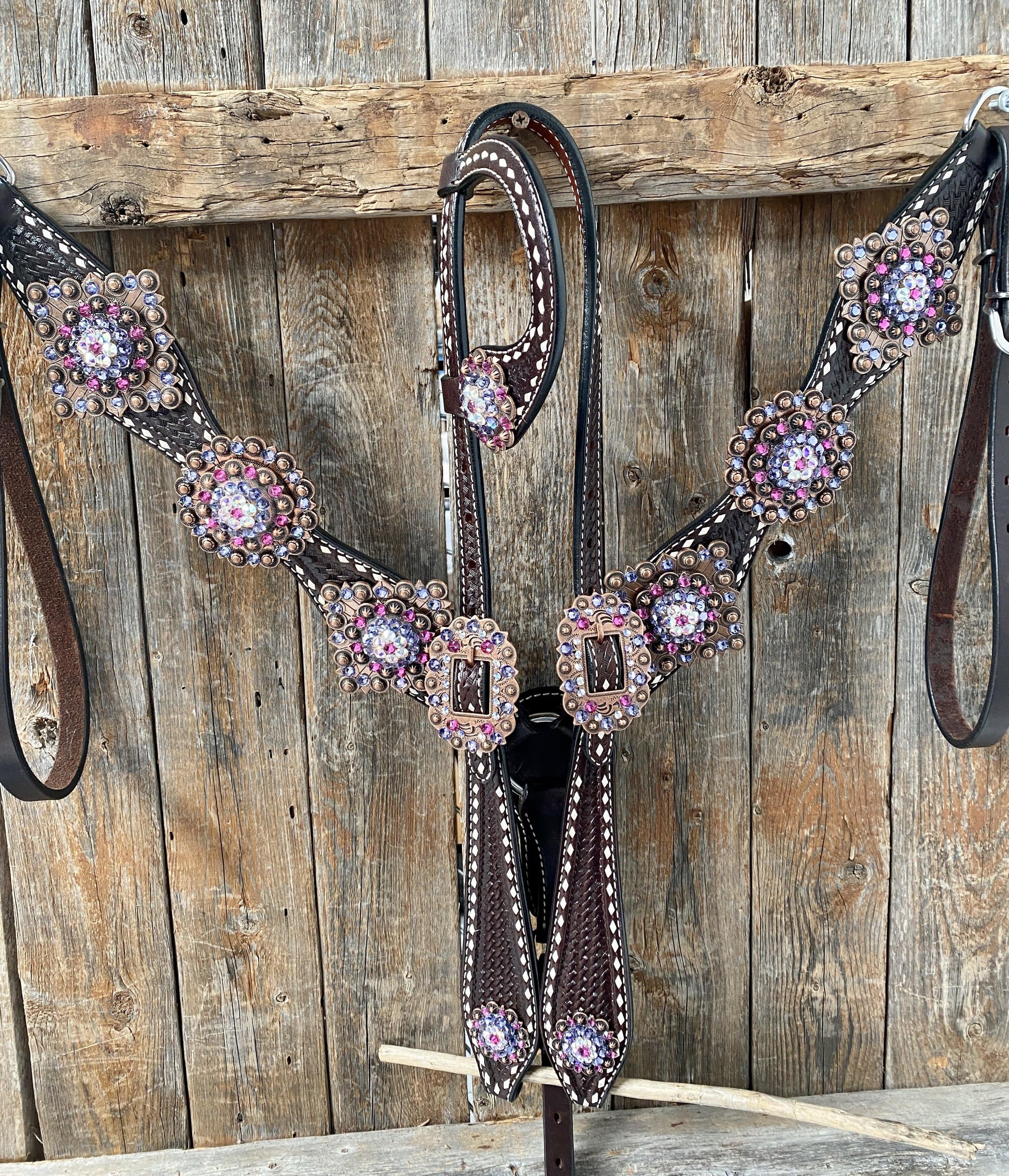 One ear and breastcollar in dark oil buckstitch style. They are decorated with copper Fuchsia/AB/Lilac conchos and buckles.