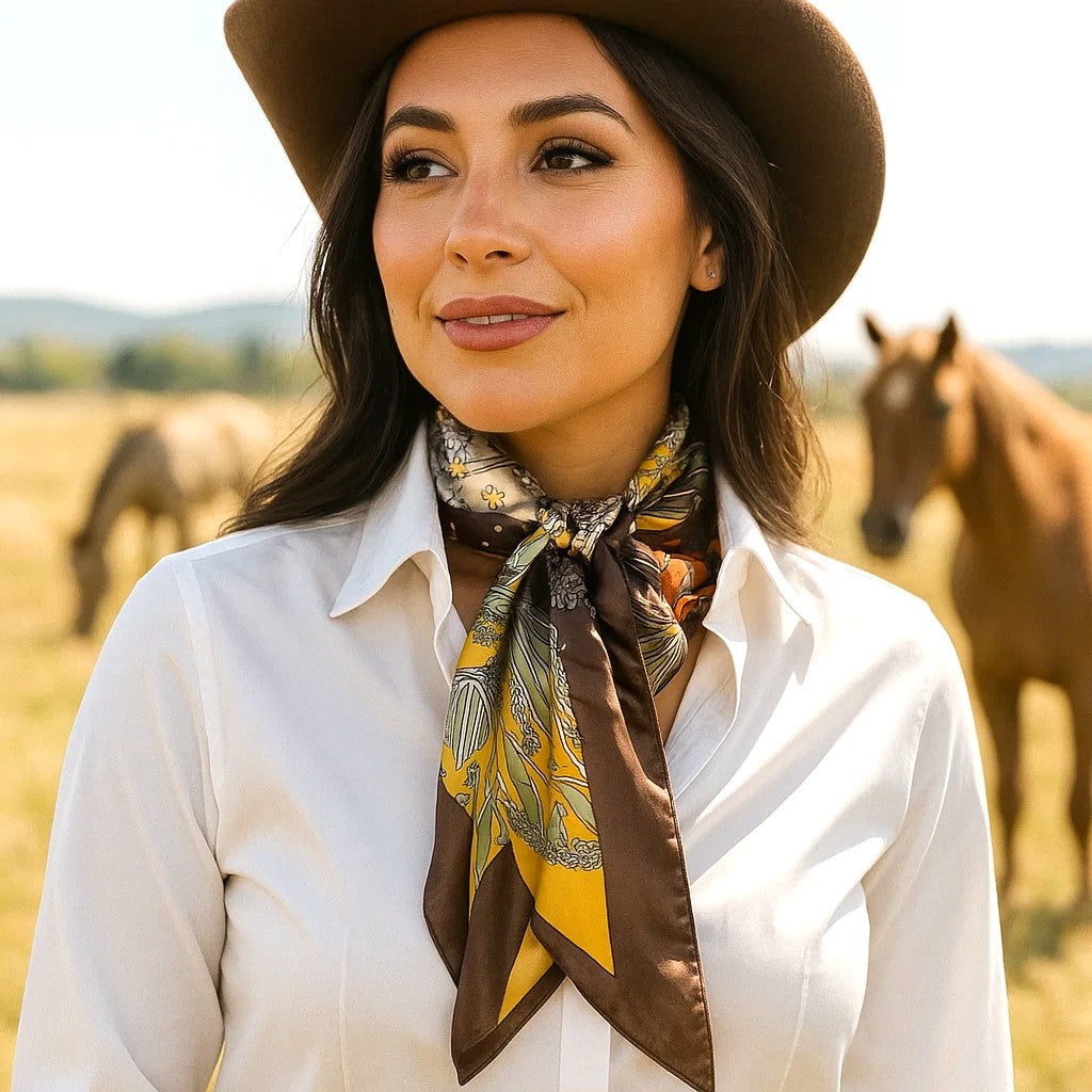 Our classic wild rag/scarf trimmed in brown and yellow with an assortment of floral patterns.
