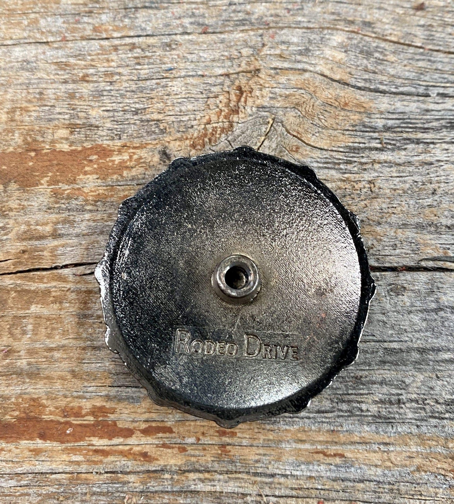 Antique silver western concho with a round shape. Decorated with a bright silver fleur de lis cross. This measures at 1".