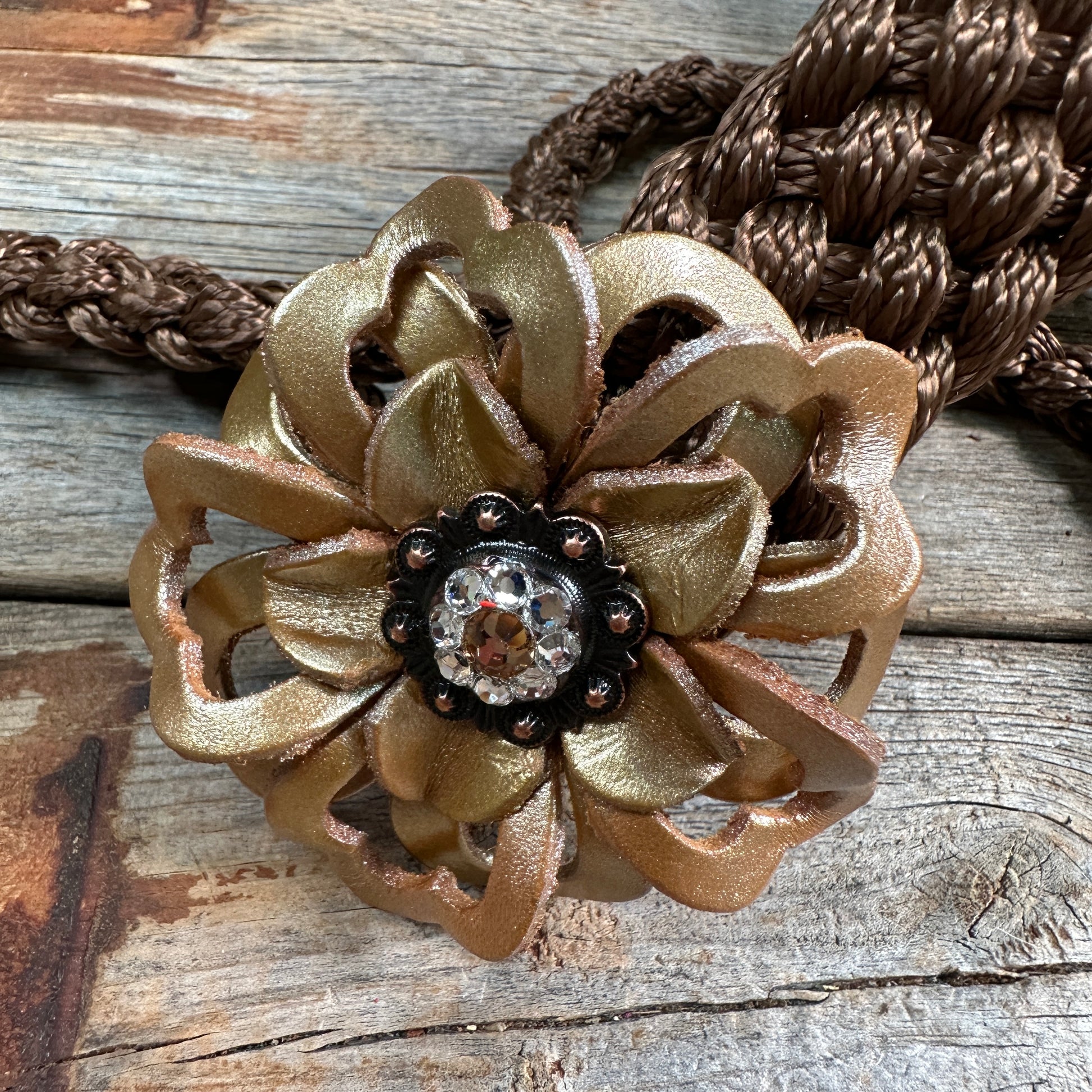 Favorite brown mule tape. Decorated with copper Champagne/Clear crystal conchos and gold leather lotuses.