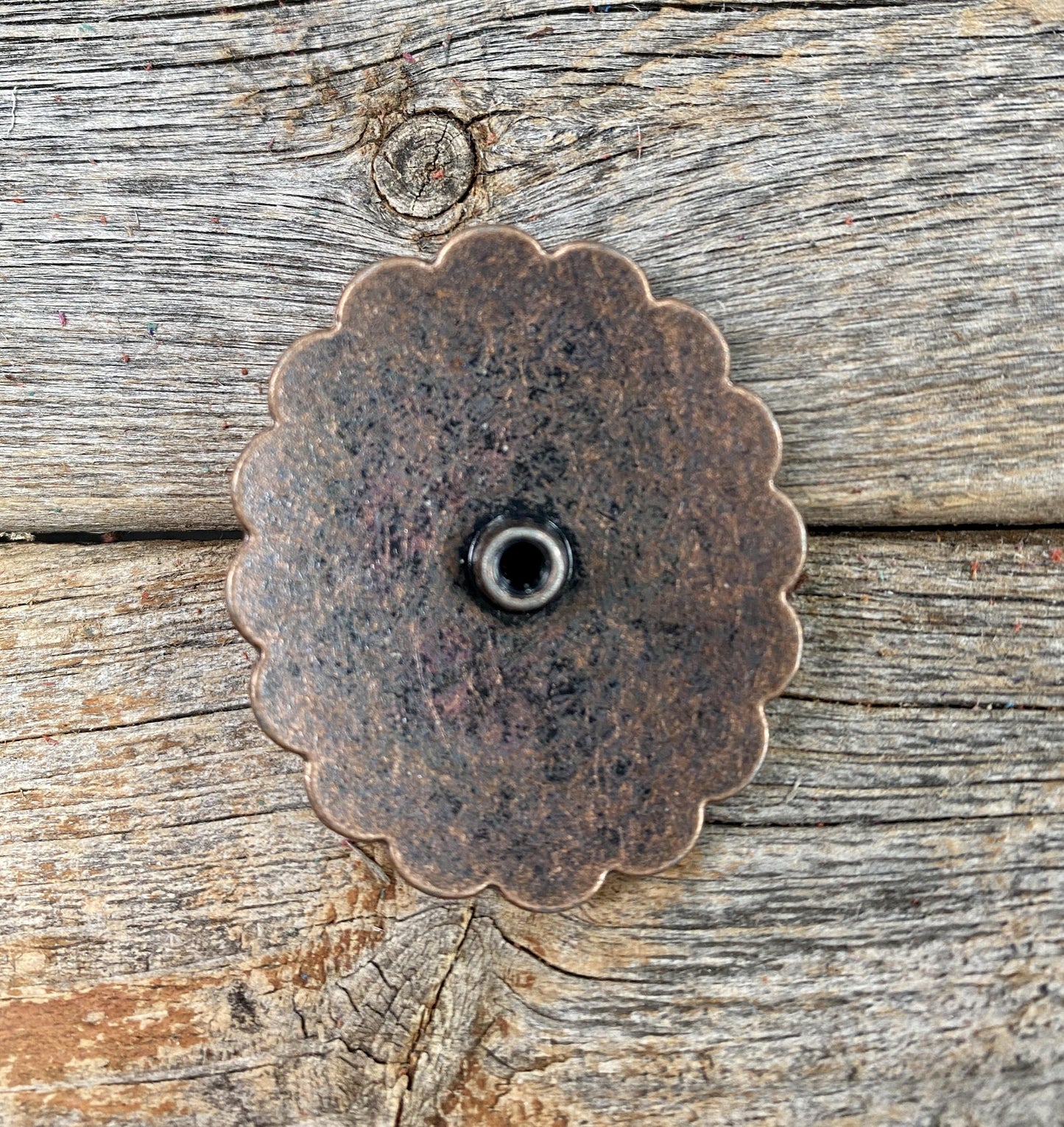 Copper western concho with an oval shape. Decorated with a turquoise stone and a scalloped edge. This measures at 3/4".