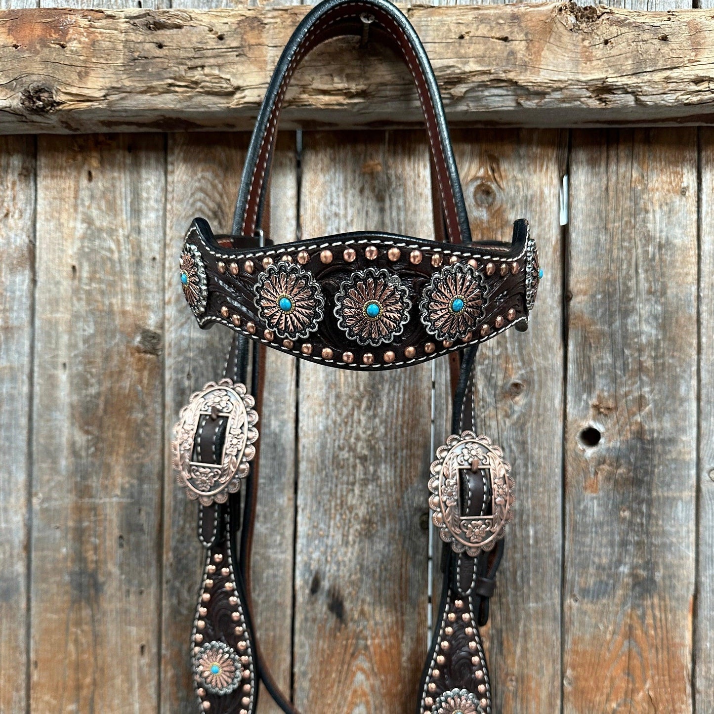 Dark Oil Floral Copper Dot & Turquoise Browband Headstall / Breastcollar Tack Set #BBBC535