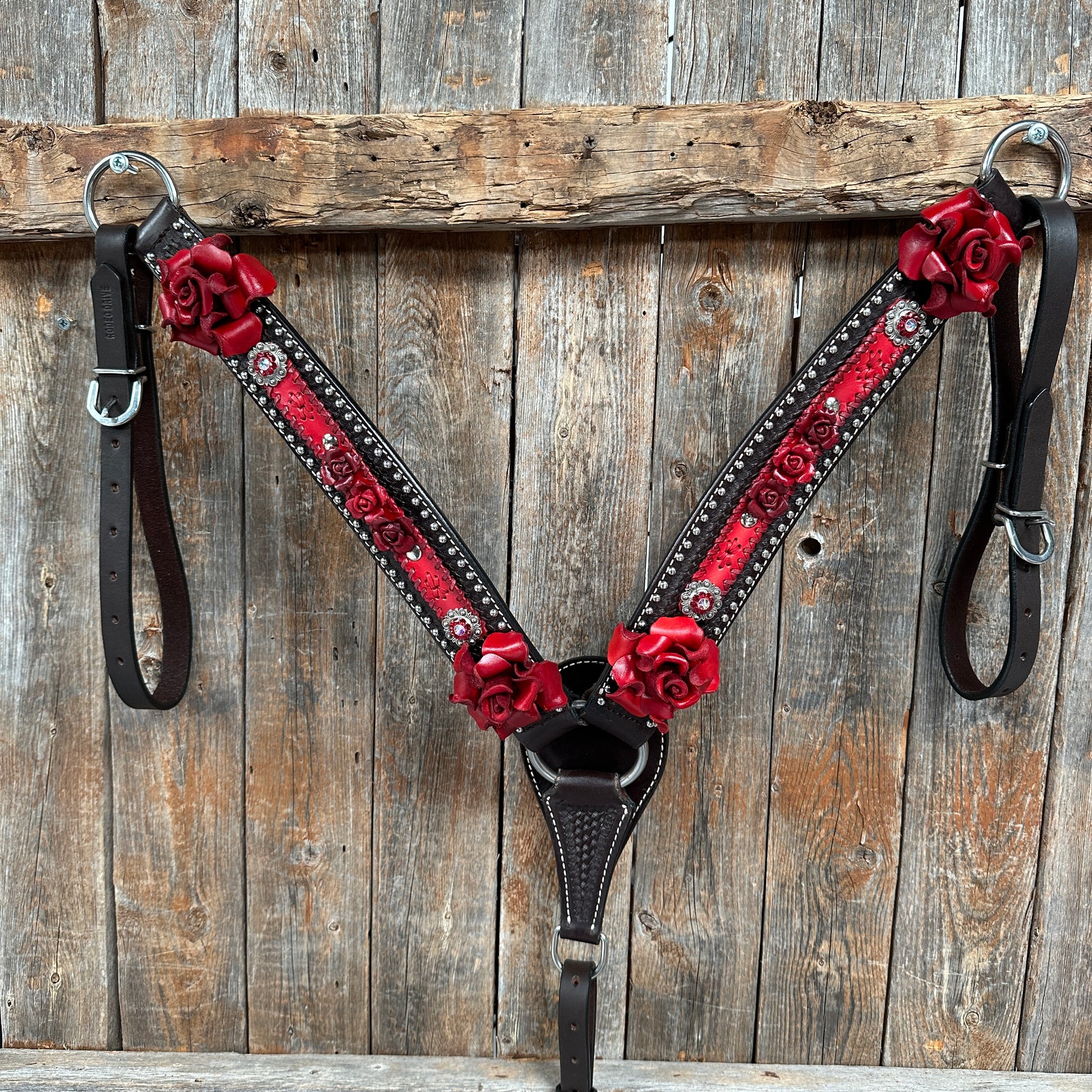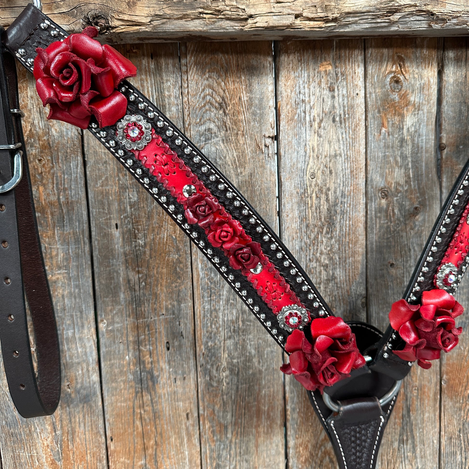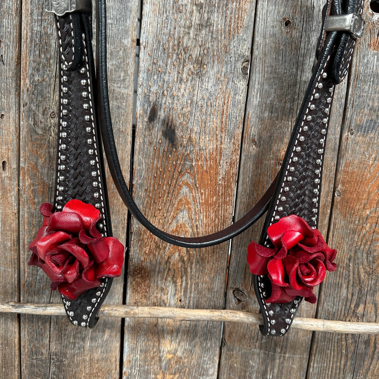 Browband and breastcollar is dark oil with silver dots and basketweave tooled. They are decorated with antique silver Ruby/AB crystal conchos/buckles, red leather strips with roses and red roses .