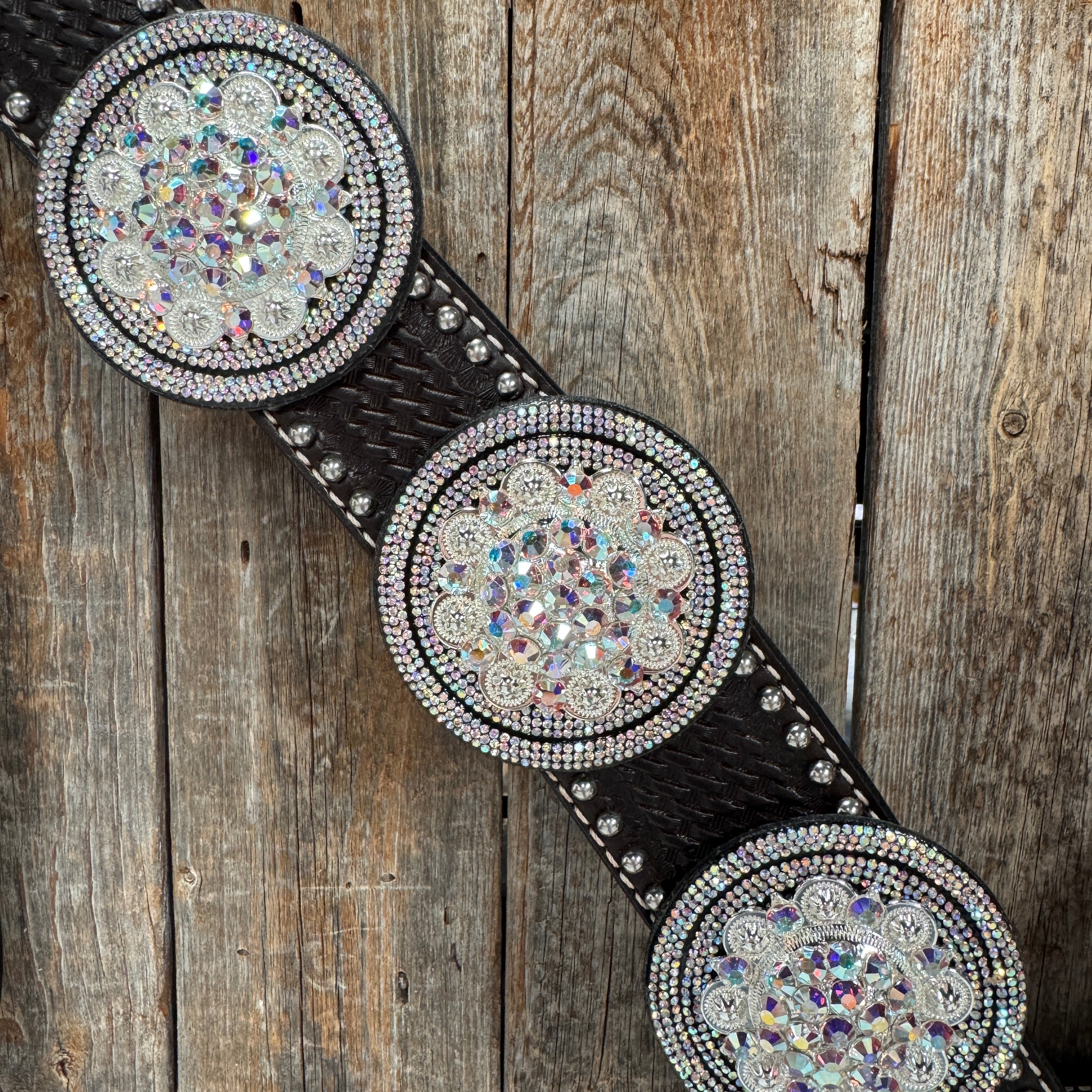 One ear and breastcollar is dark oil with silver dots and basketweave tooled. They are decorated with bright silver AB crystal conchos/buckles and black rhinestone rosettes .
