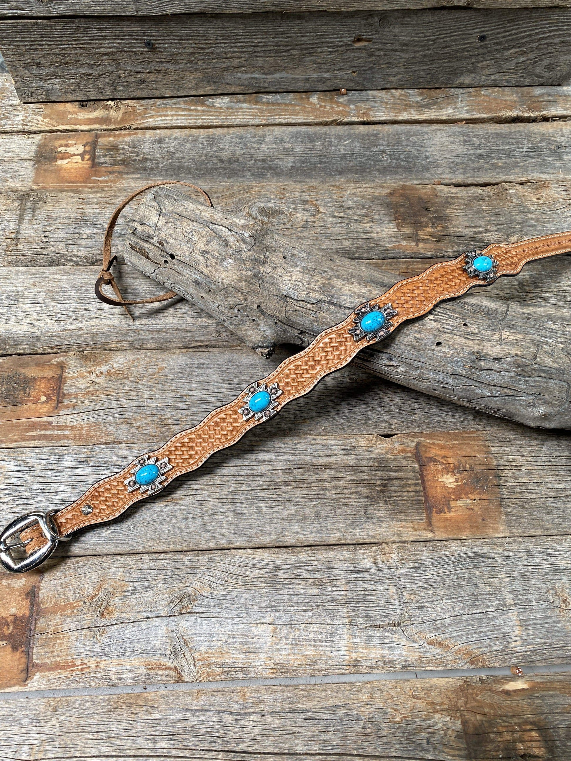 Handmade leather light oil dog collar with basketweave tooling. Decorated with four antique silver turquoise western conchos.