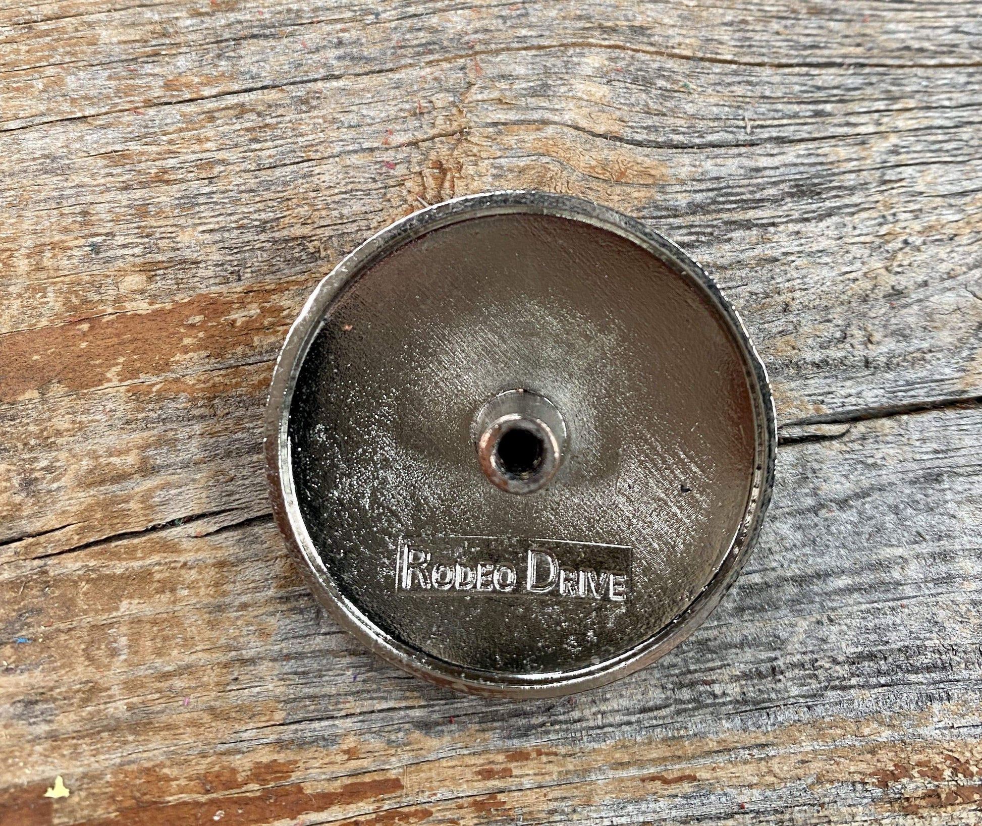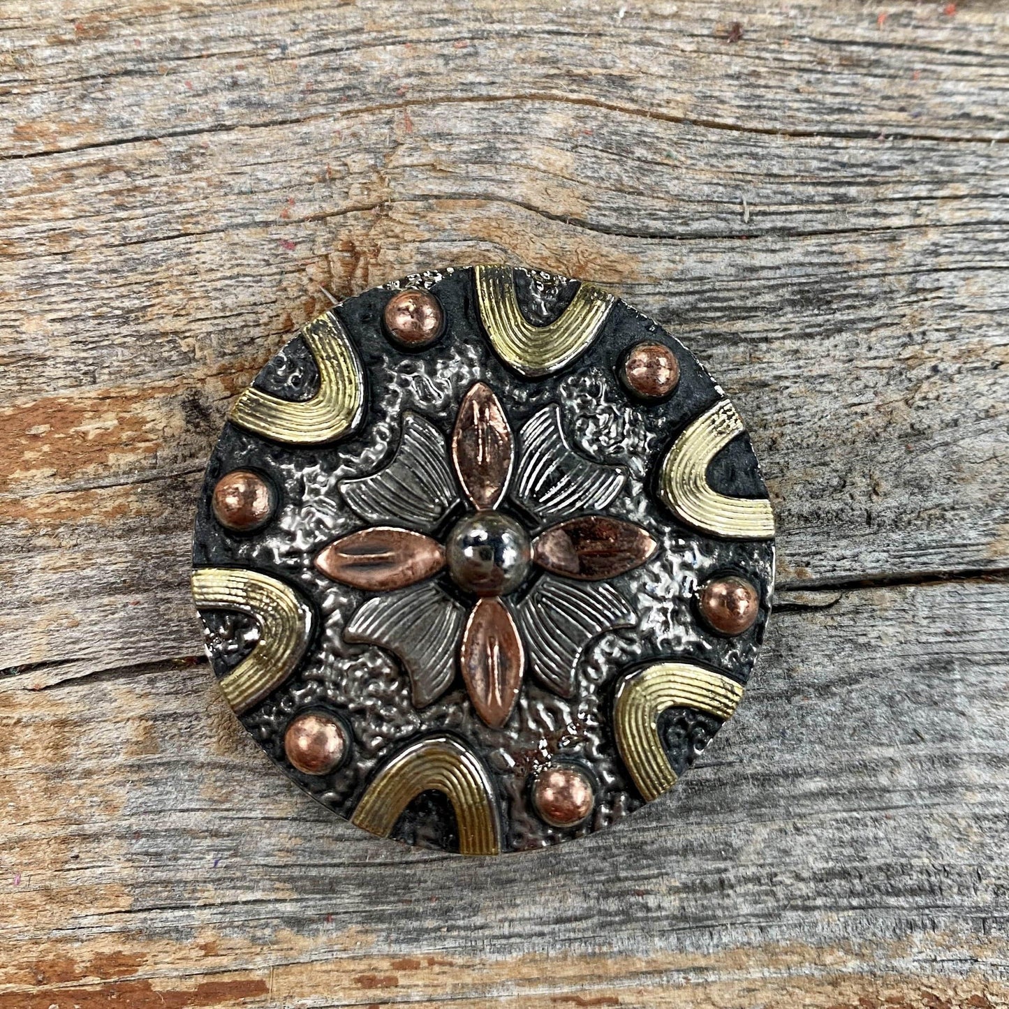 Antique western concho with a round shape. Decorated with copper dots and gold triangles. This measures at 1".