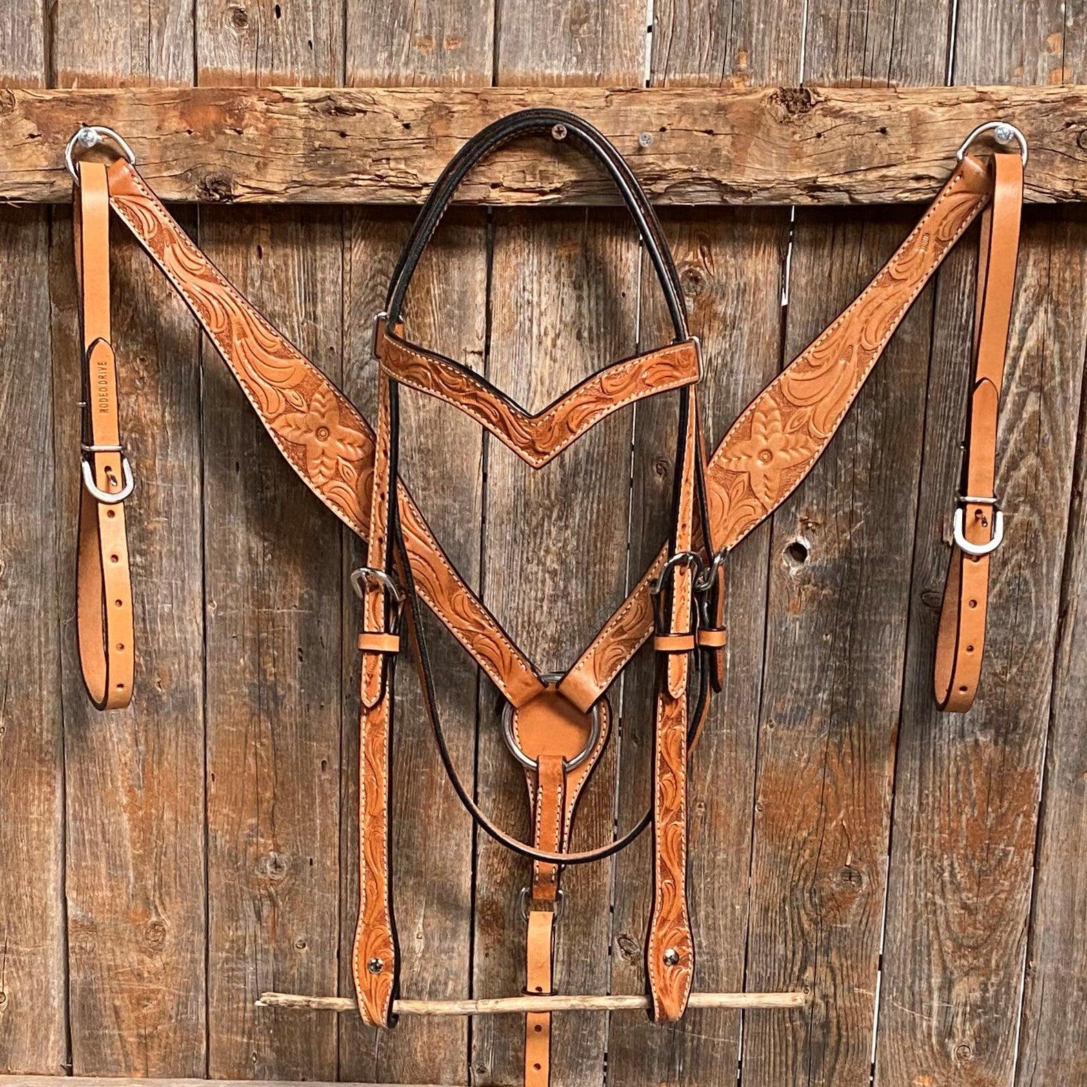 Browband and breastcollar is light oil leather with a floral tooled design.