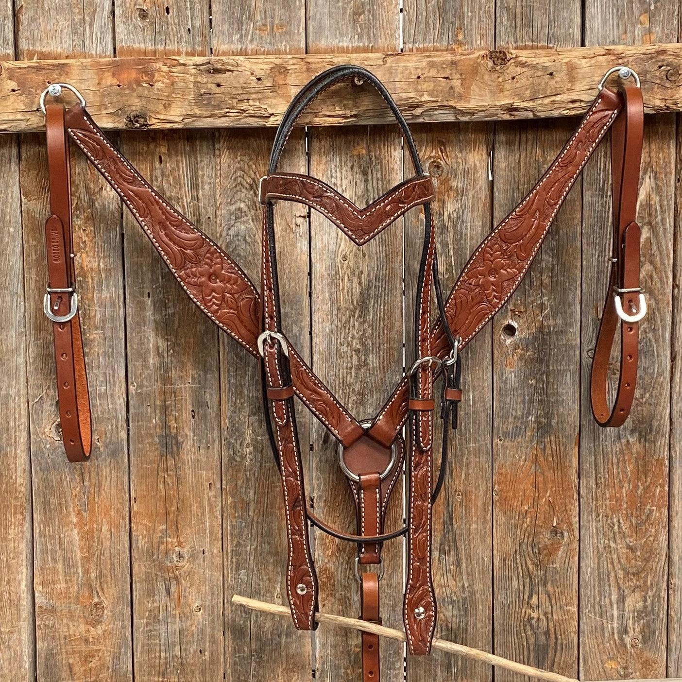 Browband and breastcollar is medium oil leather with a floral tooled design.