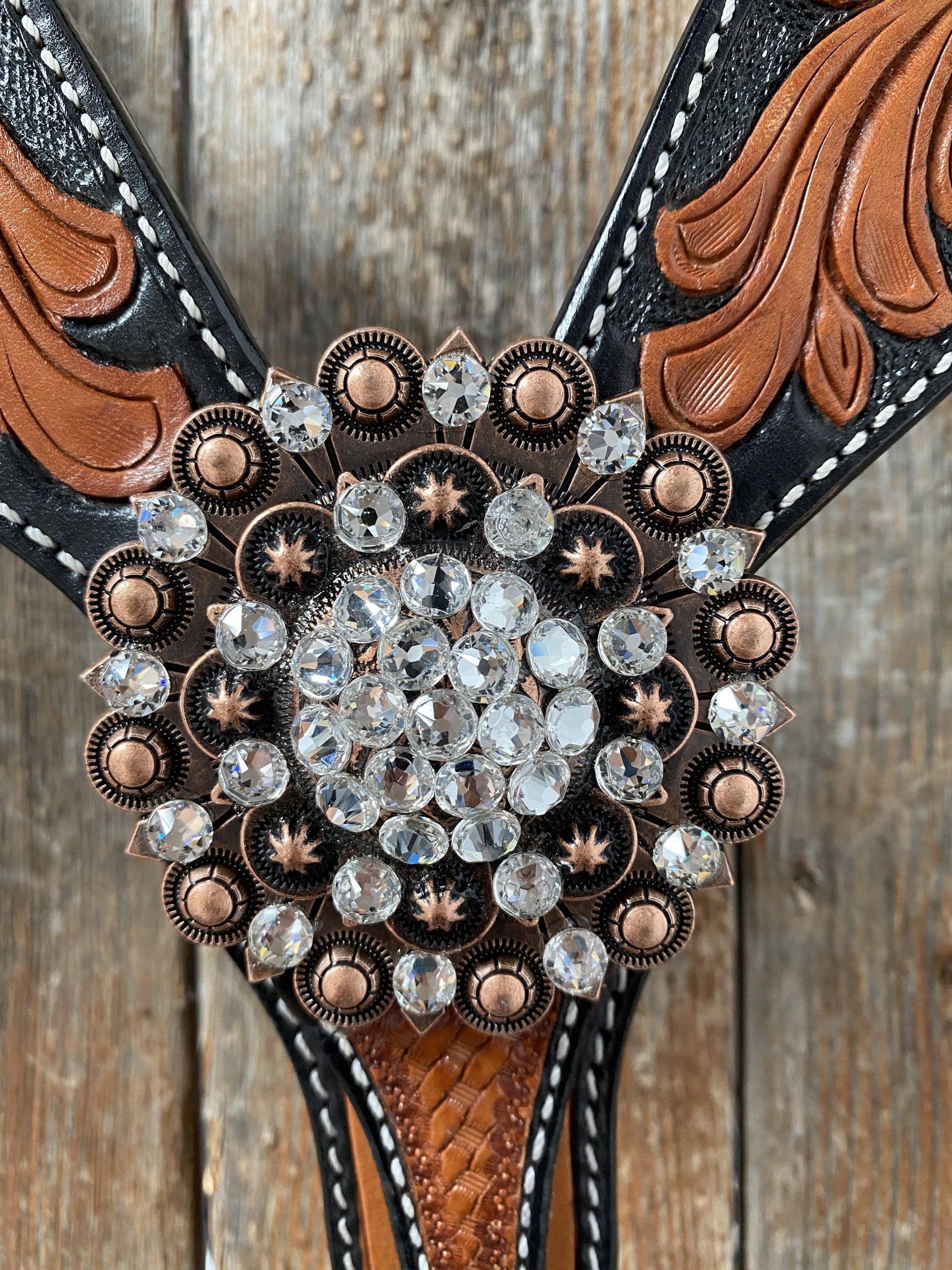 One ear and breastcollar is two tone leaf scalloped style. They are decorated with clear copper conchos and buckles.
