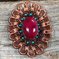 Leather rosette with medium oil edges and hand painted turquoise dots. Along with copper western concho decorated with a fuchsia cabochon stone. This measures at 2.75 " long and 2" wide.