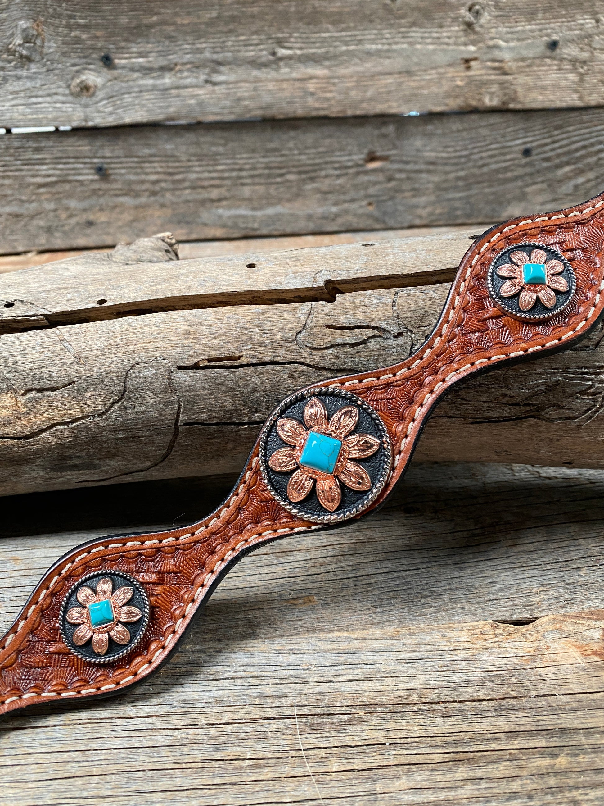 Decorated with copper turquoise sunflower conchos with 1 that measures 1.5" and 2 that measure 1". Buckles are decorated with a black background and copper flowers.