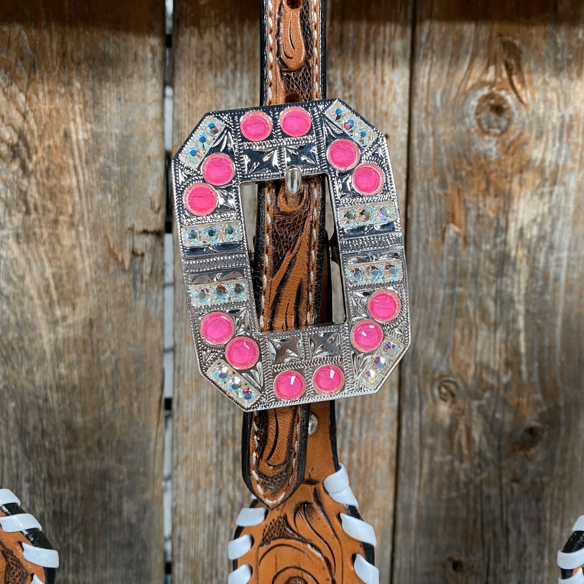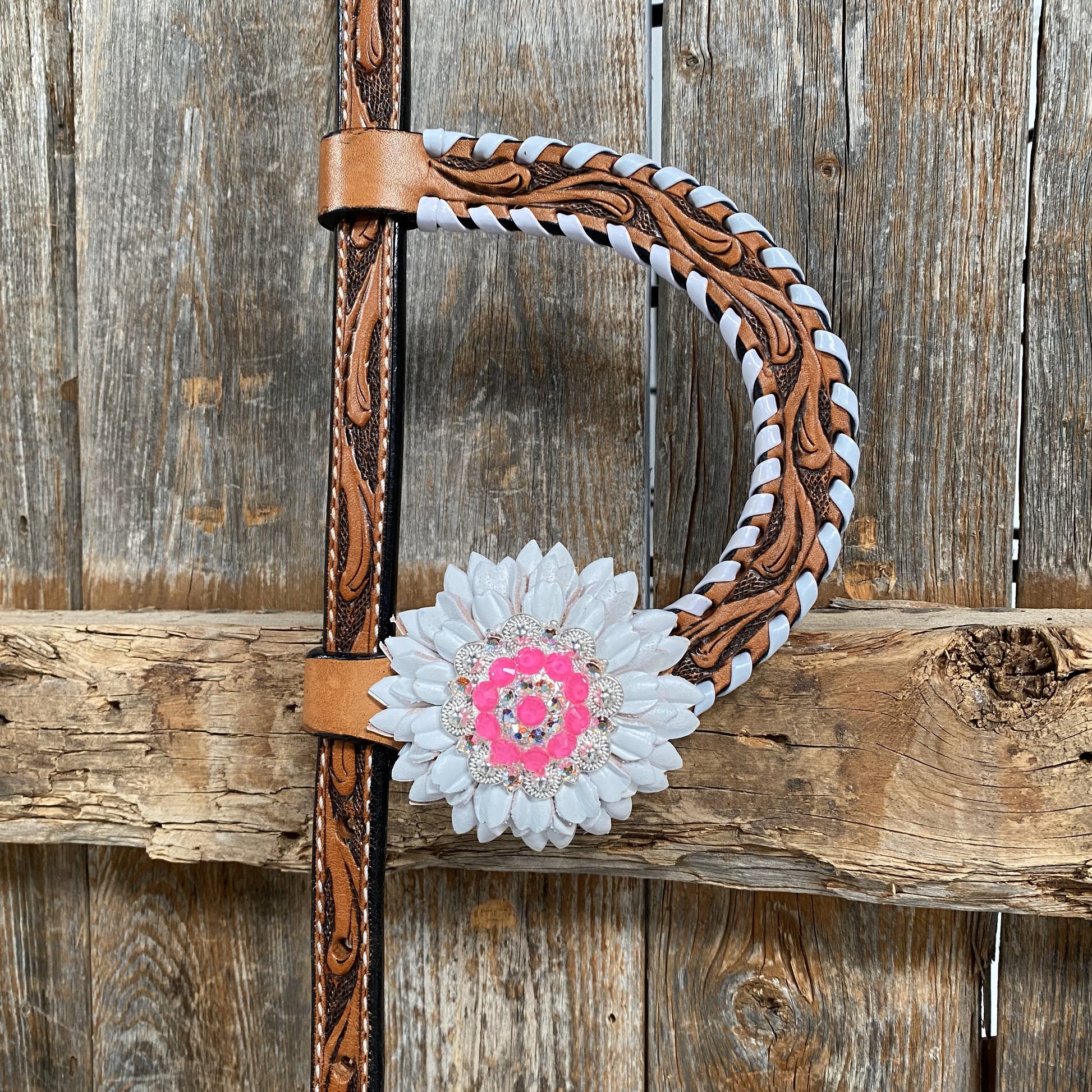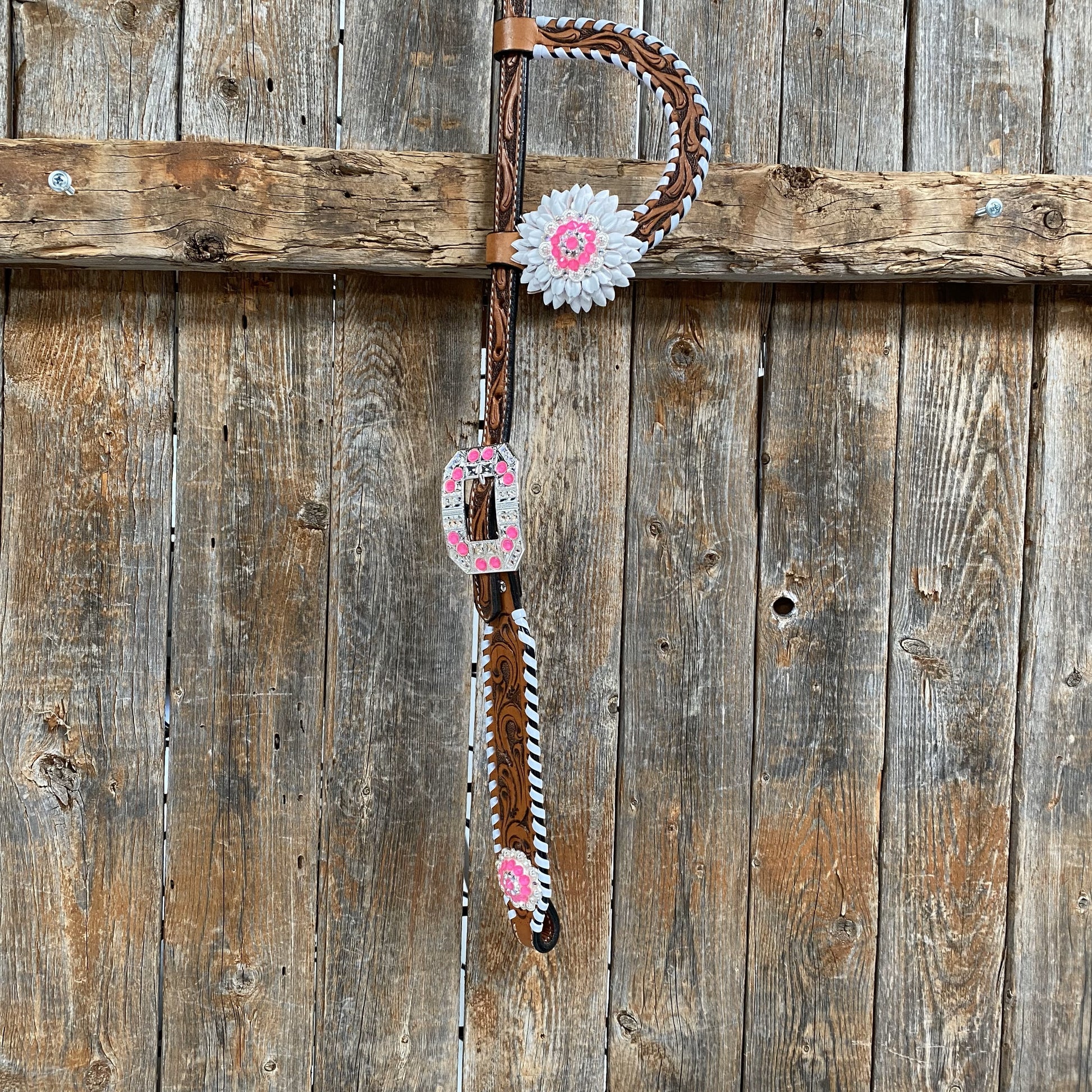 One Ear and breastcollar is light oil floral whipstitch style. They are decorated with bright silver Neon Pink/AB crystal conchos/buckles and white daisies.