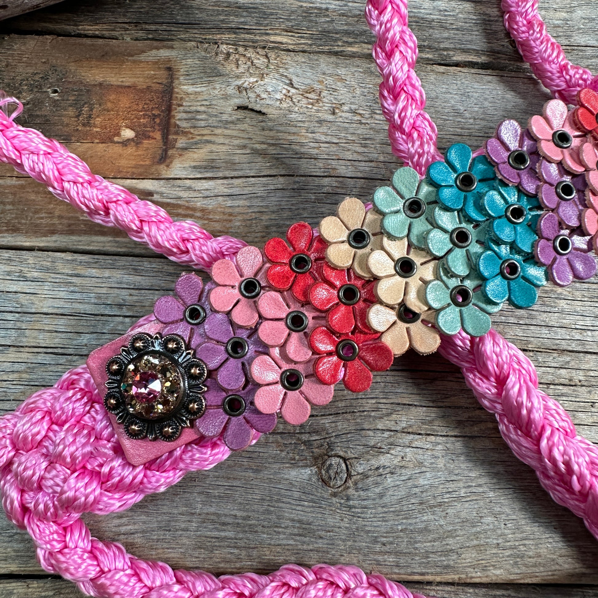 Our favorite pink mule tape with multi-colored floral leather nose band. Decorated with copper Pink/Champagne crystal conchos.