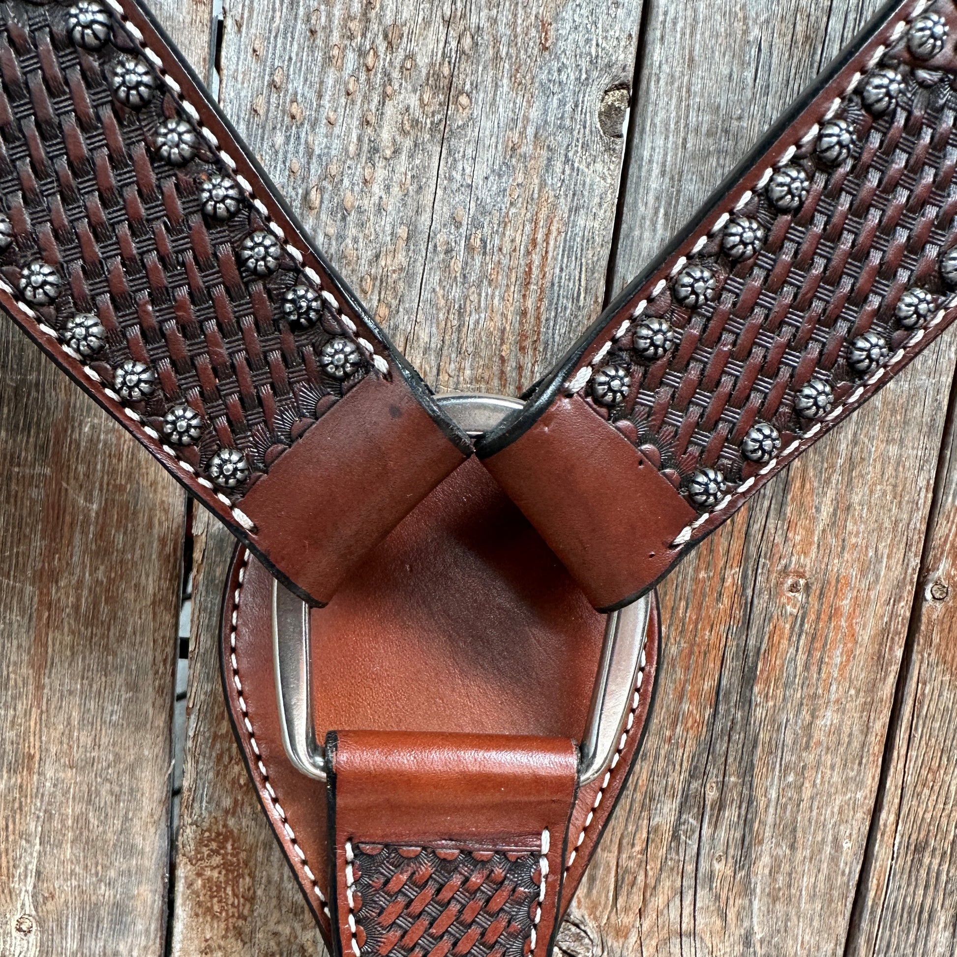 Western style, full horse size breastcollar. Gorgeous basketweave two tone oil leather with accents of rawhide stitching and antique silver dots.