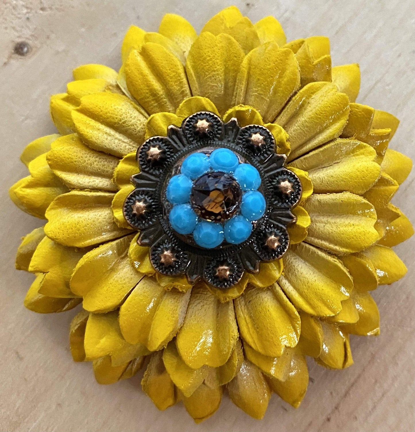 Handmade Leather Yellow sunflower. Accented with copper topaz/turquoiseconcho.