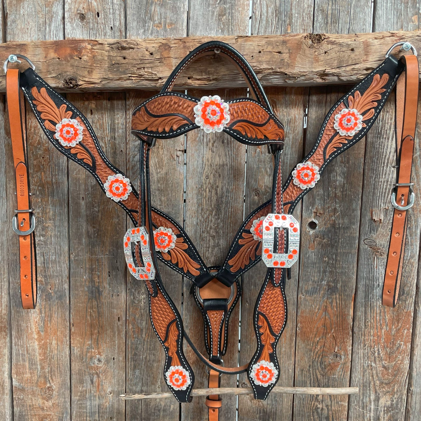 Two Tone leather browband/one ear headstall and breastcollar. They are decorated with bright silver Neon Orange/AB crystal conchos and buckles.