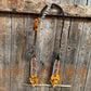 One ear is in the light oil white whipstitch style. It is decorated with antique silver Champagne/AB crystal conchos/buckles and yellow roses.