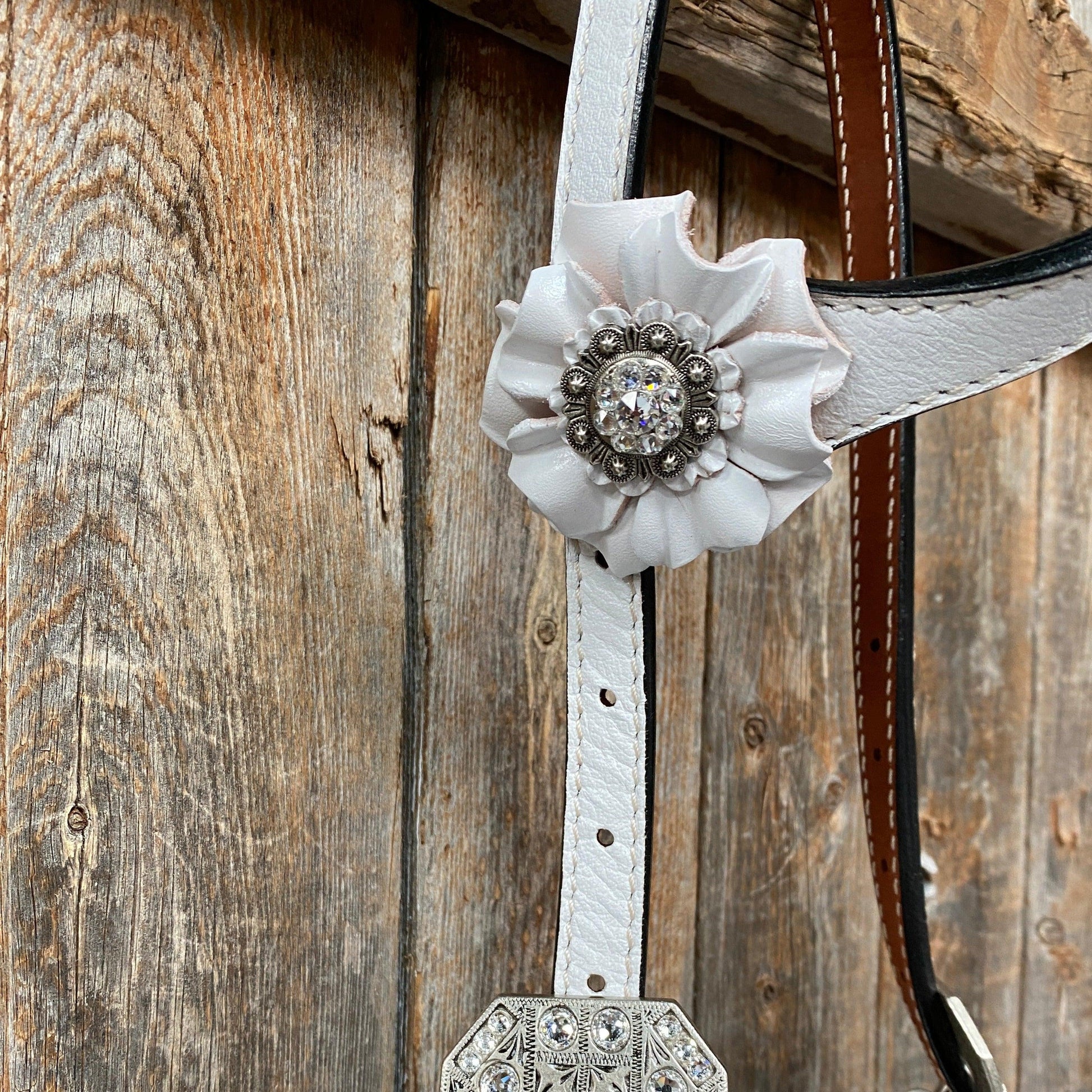 One ear and breastcollar set in white leather. They are decorated with white carnations and clear antique silver conchos and buckles.