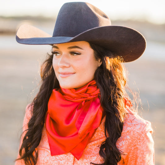 Woman wearing a cowboy hat and colorful wild rag  scarf in a natural setting