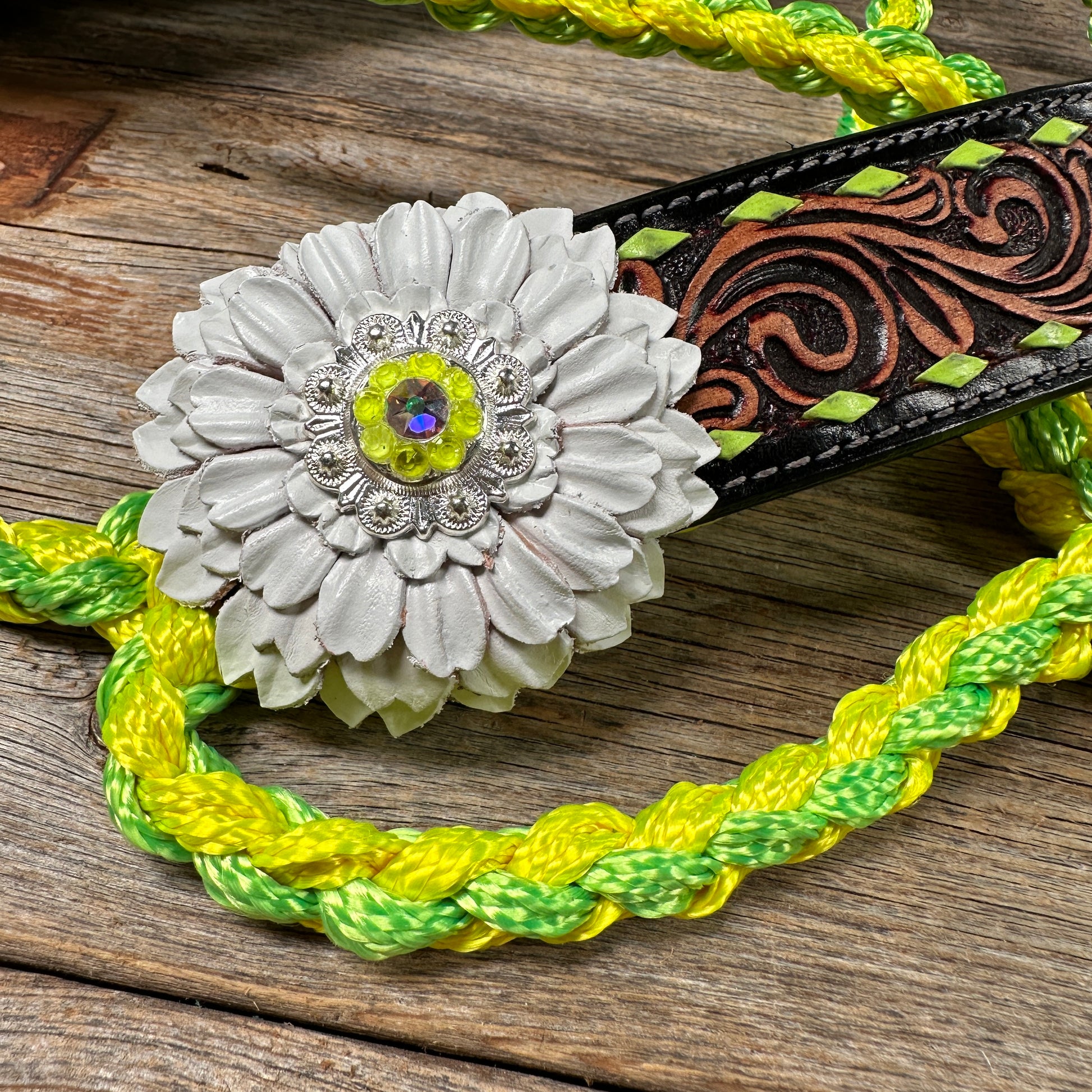 Our favorite yellow and lime mule tape with lime buckstitch leather nose band. It is decorated with bright silver Neon Yellow/AB crystal conchos and white daisies.